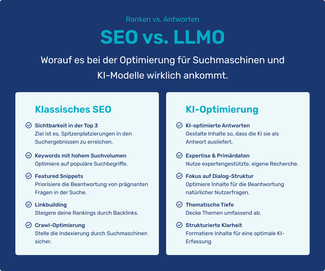 LLMO bewertet zusätzlich Verständlichkeit, Kontext und Zitierfähigkeit.