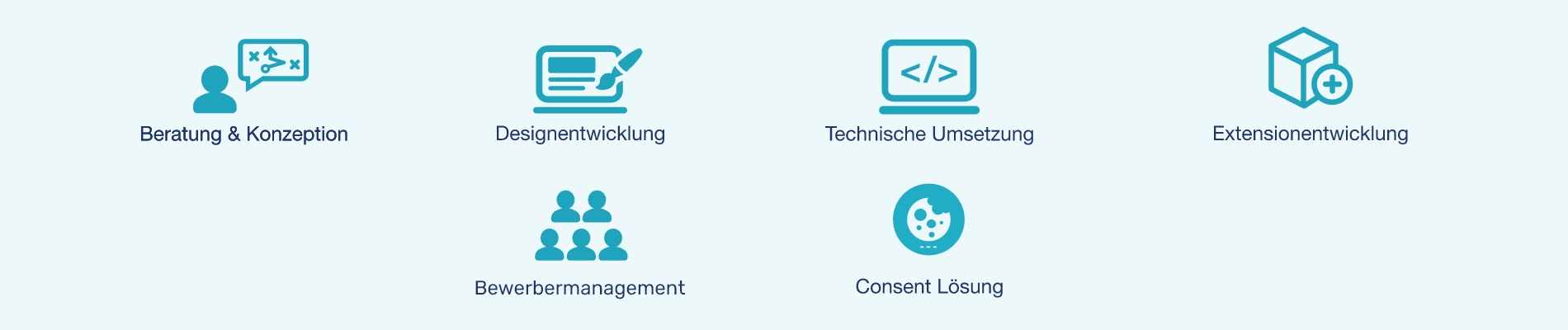 Die Leistungsbereiche und Projekte sollten stärker in den Vordergrund rücken, während eine einfache und schnelle Kontaktaufnahme ermöglicht wird. Gleichzeitig sollte ein bestehender Drittanbieter für Bewerbungen abgelöst und durch eine integrierte Lösung ersetzt werden.